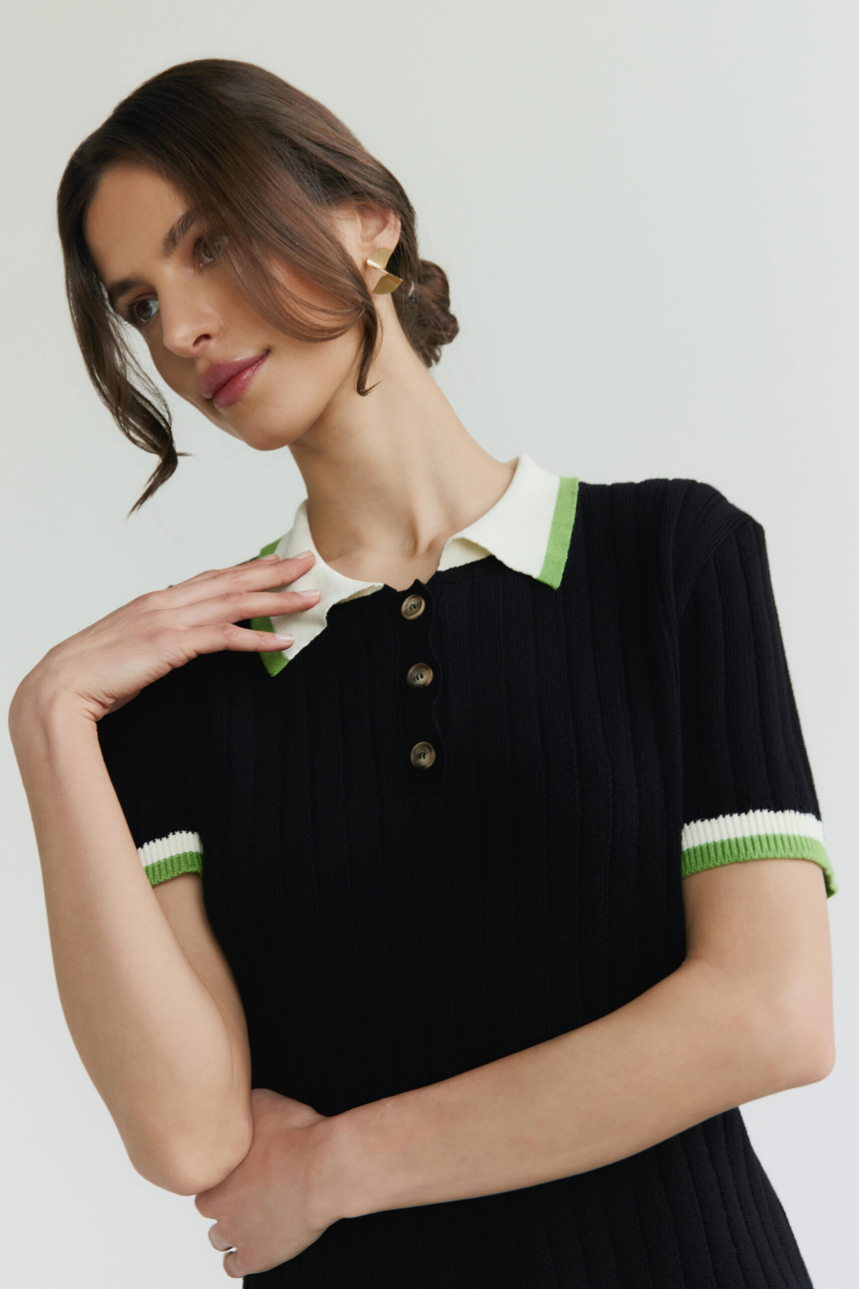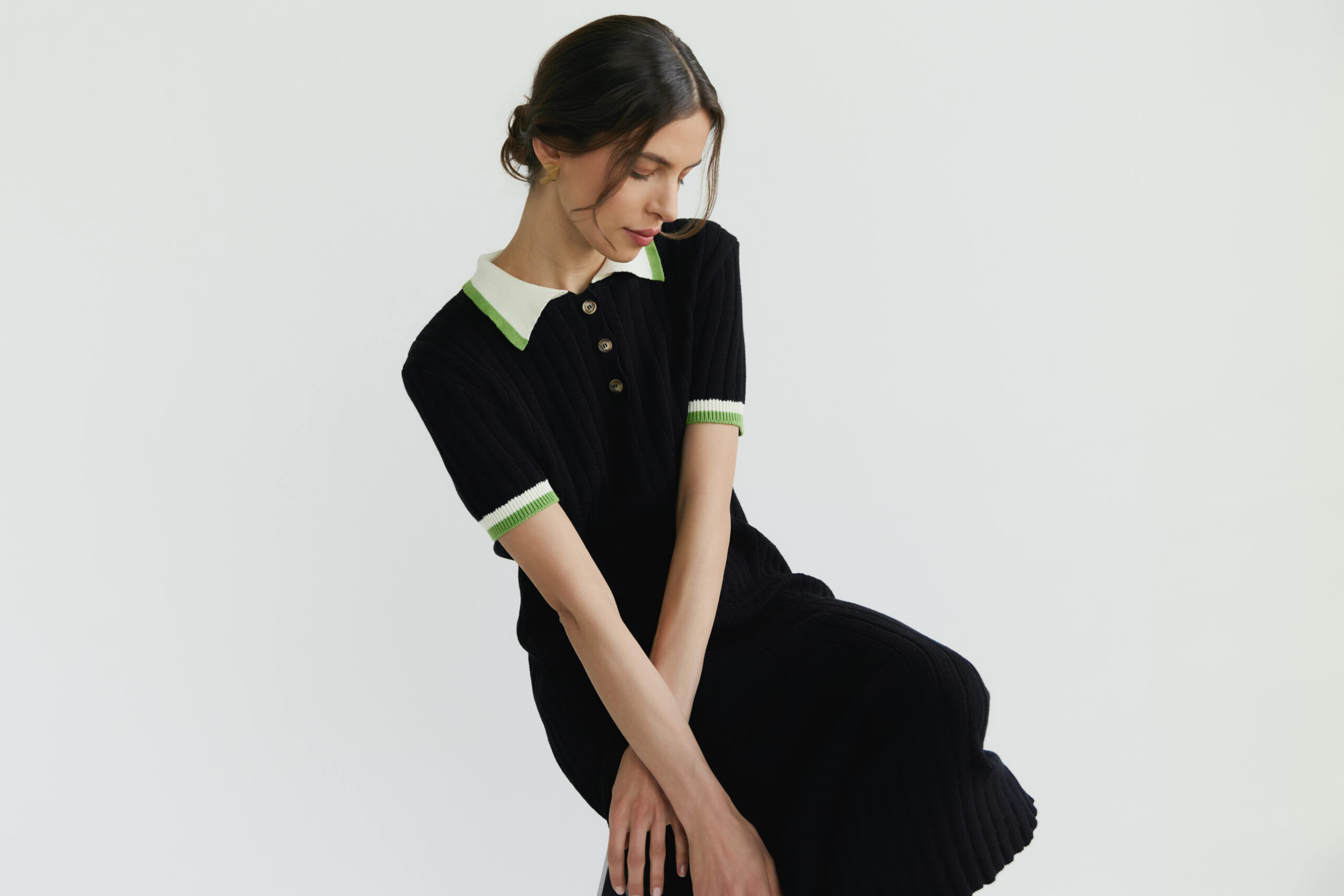 Strukturální pruhy jemně prodlužují siluetu a dodávají jí nonšalantní, ale sofistikovaný charakter. Límec a rukávy jsou zdůrazněny kontrastními vložkami, které celku dodávají výjimečnou lehkost a originální výraz.