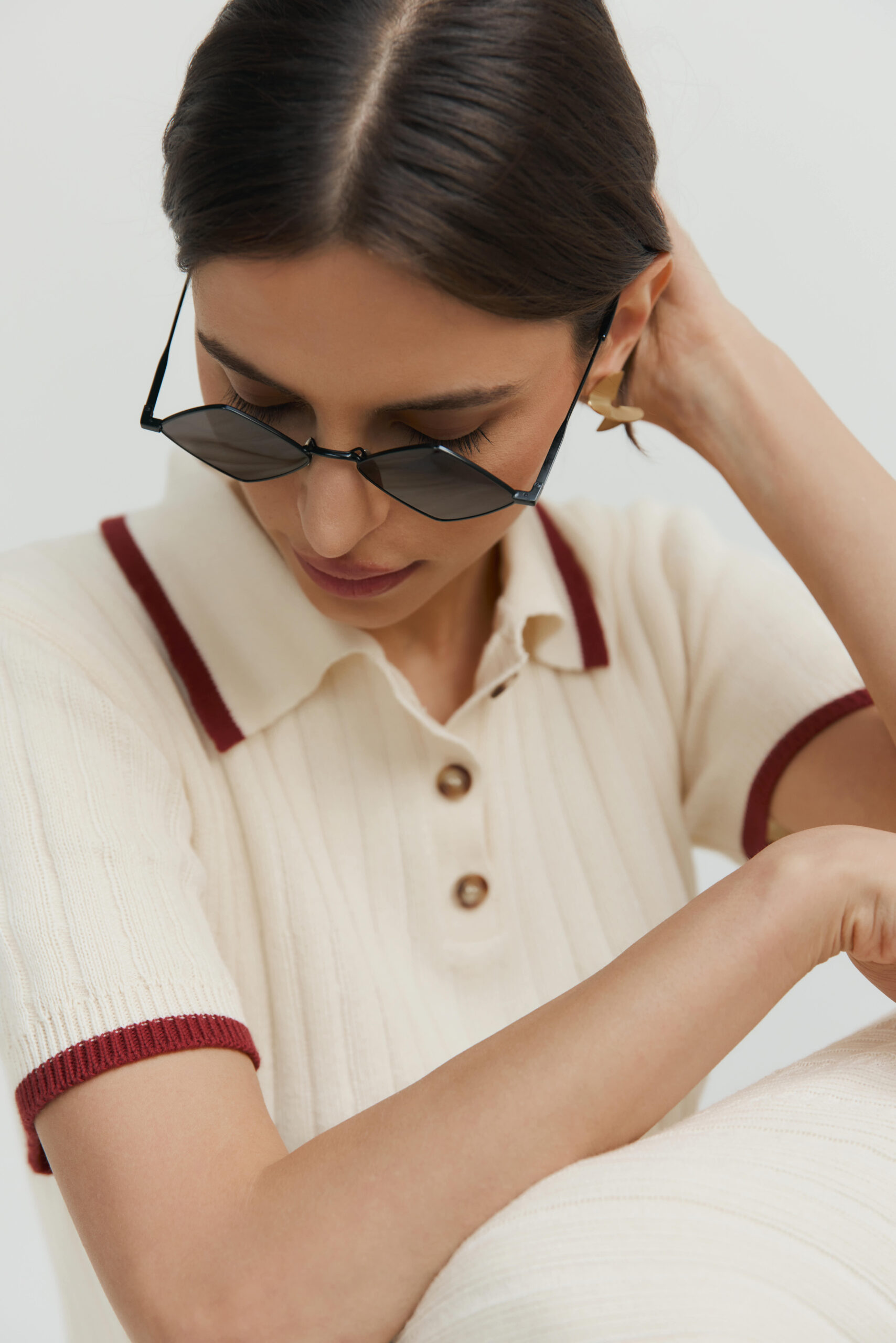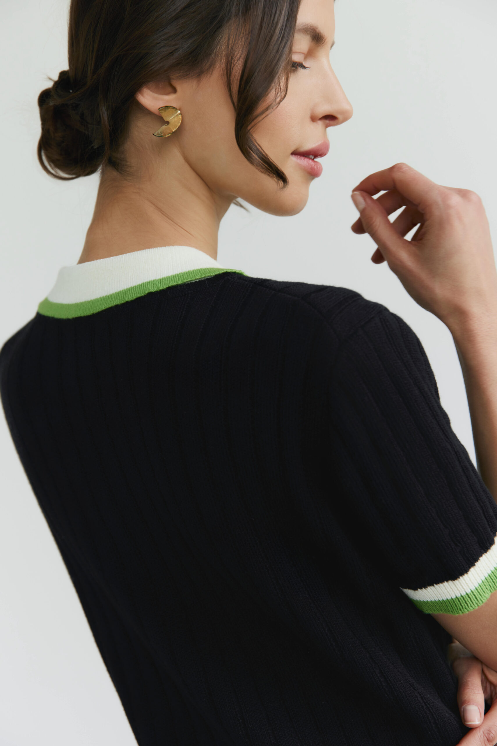 Strukturální pruhy jemně prodlužují siluetu a dodávají jí nonšalantní, ale sofistikovaný charakter. Límec a rukávy jsou zdůrazněny kontrastními vložkami, které celku dodávají výjimečnou lehkost a originální výraz.